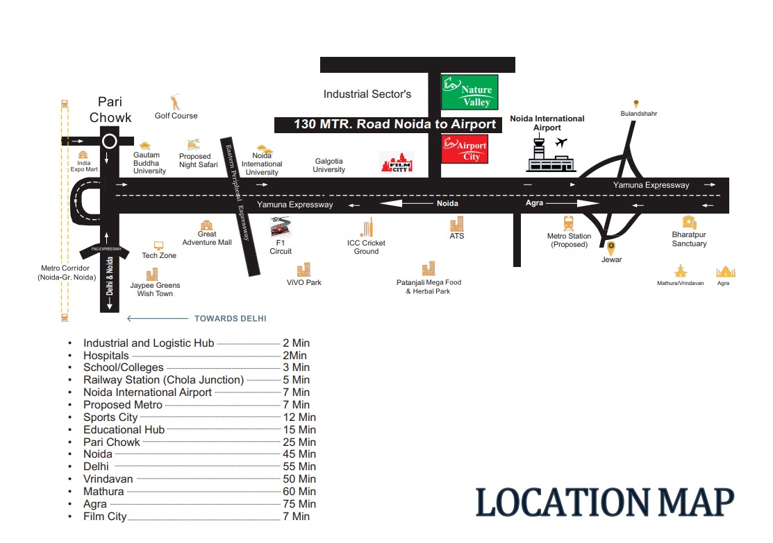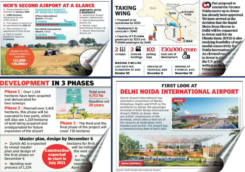 Noida International Airport or Jewar Airport is a proposed airport to be constructed in Jewar (56 kilometers from Noida) in Gautam Budh Nagar, a district of Uttar Pradesh. The Yamuna Expressway Industrial Development Authority (YEIDA) will be the implementing agency on behalf of the Government of Uttar Pradesh. The airport is to be developed through a Public Private Partnership model (PPP). The proposed plan is to build a two runway airport by 2023-24 and at a future date, to expand it into a 5000 Hect 8-runway airport. According to the proposed plan, the airport will handle 5 million ?passengers per annum (MPA) initially and up to 70 MPAafter its expansion over a period of 30 years. The project site is located 72 kilometers from Indira Gandhi International Airport, the airport that currently serves the needs of the entire National Capital ?Region and is quickly reaching its peak capacity, 36 km from Bulandshahr, • 60 km from Noida & • 70 km from Faridabad & Ghaziabad, about • 30 km from Greater Noida, • 65 km from Aligarh, 65 km from Gurgaon and •130 km from Agra. • It will be connected to the Yamuna Expressway, allowing domestic and international tourists to reach Agra, Mathura and Vrindavan.
